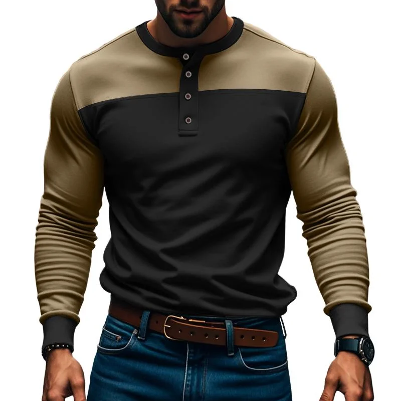 Introducing the Men's Casual Vintage Long Sleeve Colorblock Henley T-Shirt—a stylish blend of classic and modern design perfect for everyday wear. This shirt is a must-have for any wardrobe, offering a versatile look that can be dressed up or down with ease.