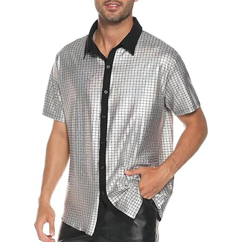 Crafted with attention to detail, the contrast sequin detailing on the lapel and buttons adds a touch of sophistication and a hint of playful charm. The short sleeves bring a casual and laid-back vibe, making this shirt perfect for a variety of occasions.