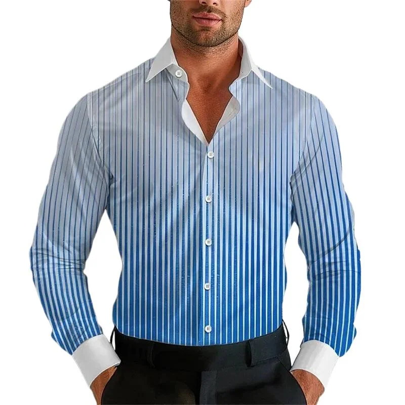 The Men's Gradient Striped Lapel Long Sleeve Shirt merges modern design with classic tailoring. This stylish shirt features a gradient striped pattern, providing a unique and eye-catching look, perfect for casual or semi-formal occasions.