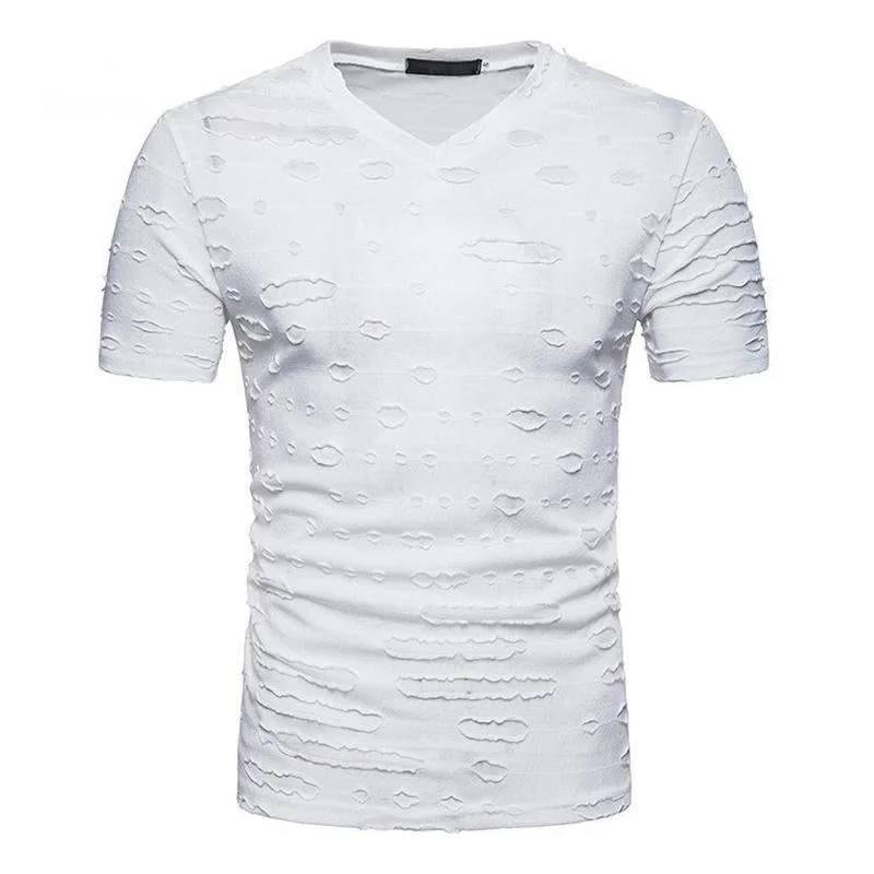 Versatile and effortlessly stylish, our Men's Ripped V-neck Short-sleeved T-shirt is a must-have addition to your wardrobe. Elevate your everyday look with this contemporary piece that exudes confidence and individuality. Whether you're hitting the streets or hanging out with friends, this T-shirt will keep you looking cool and feeling comfortable all day long. Upgrade your casual ensemble with this standout essential today!