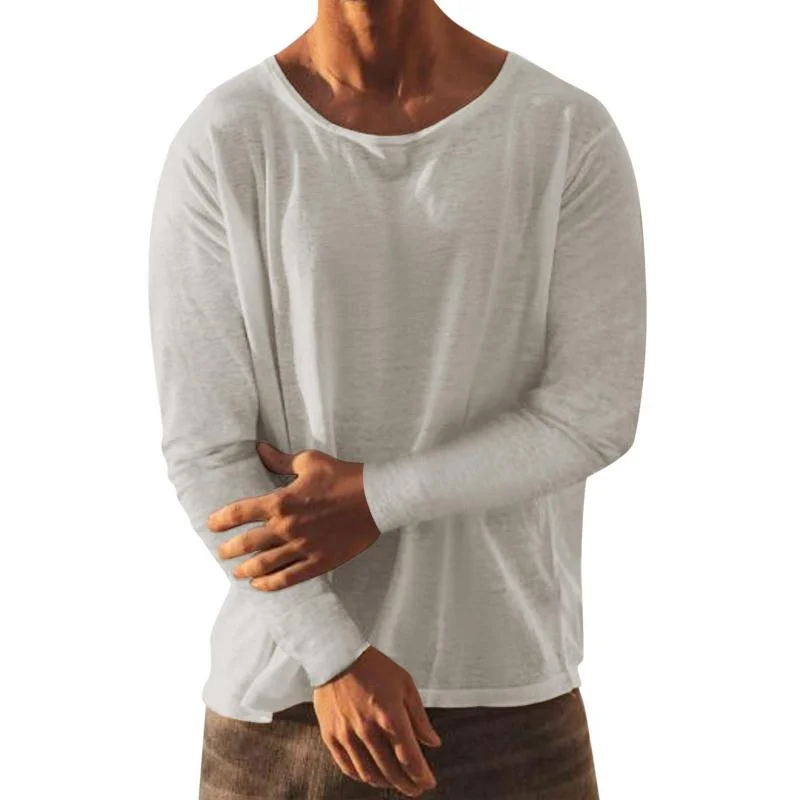 The Men's Solid Loose Round Neck Long Sleeve Linen T-shirt is a versatile piece that can be dressed up or down for various occasions. Pair it with jeans or chinos for a casual and effortless look, or layer it under a jacket for a more refined style. Experience the comfort and style of our Men's Solid Loose Round Neck Long Sleeve Linen T-shirt.