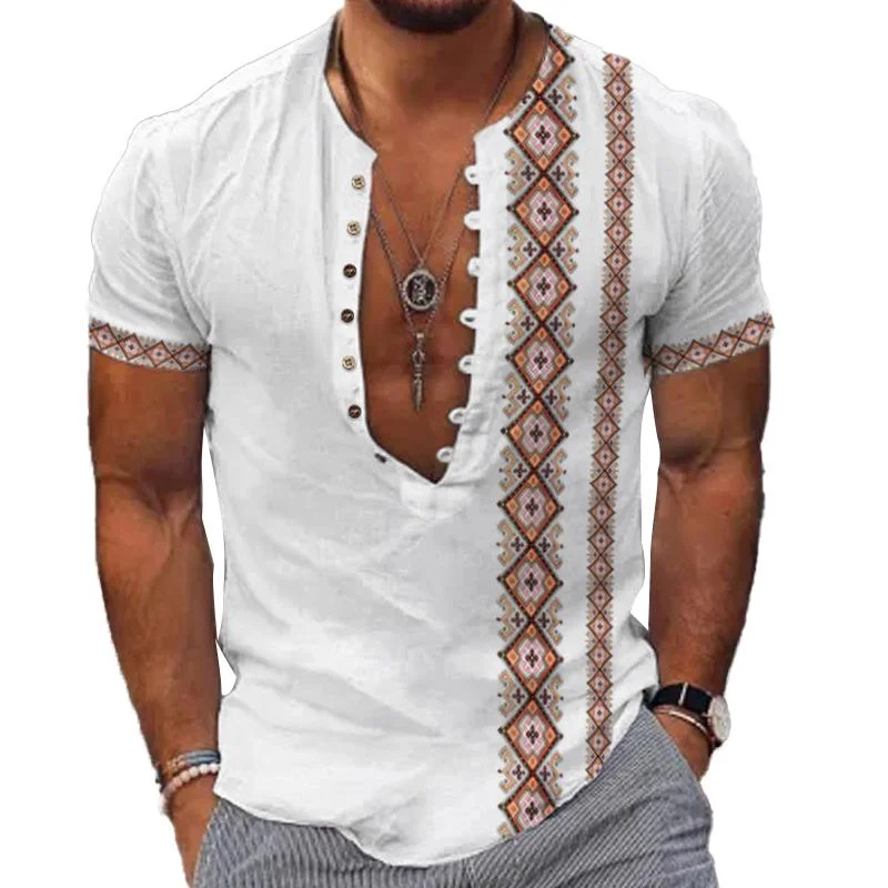 Introducing our Men's Vintage Printed Panel Round Neck Short Sleeve Shirt, a stylish and retro-inspired addition to your wardrobe. This shirt combines vintage charm with modern design elements, creating a unique and fashionable look.